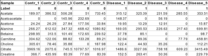 Samples in columns (paired)The screenshot below shows a subset of binned NMR spectra data (bin width 0.04 ppm). In this table, the samples from controls (e.g. Contr_1) are paired with the samples from the subjects in disease (Disease_1) based on some criteria (i.e. age, weight, gender). Each sample occupies a column and the second row is used for sample labels.